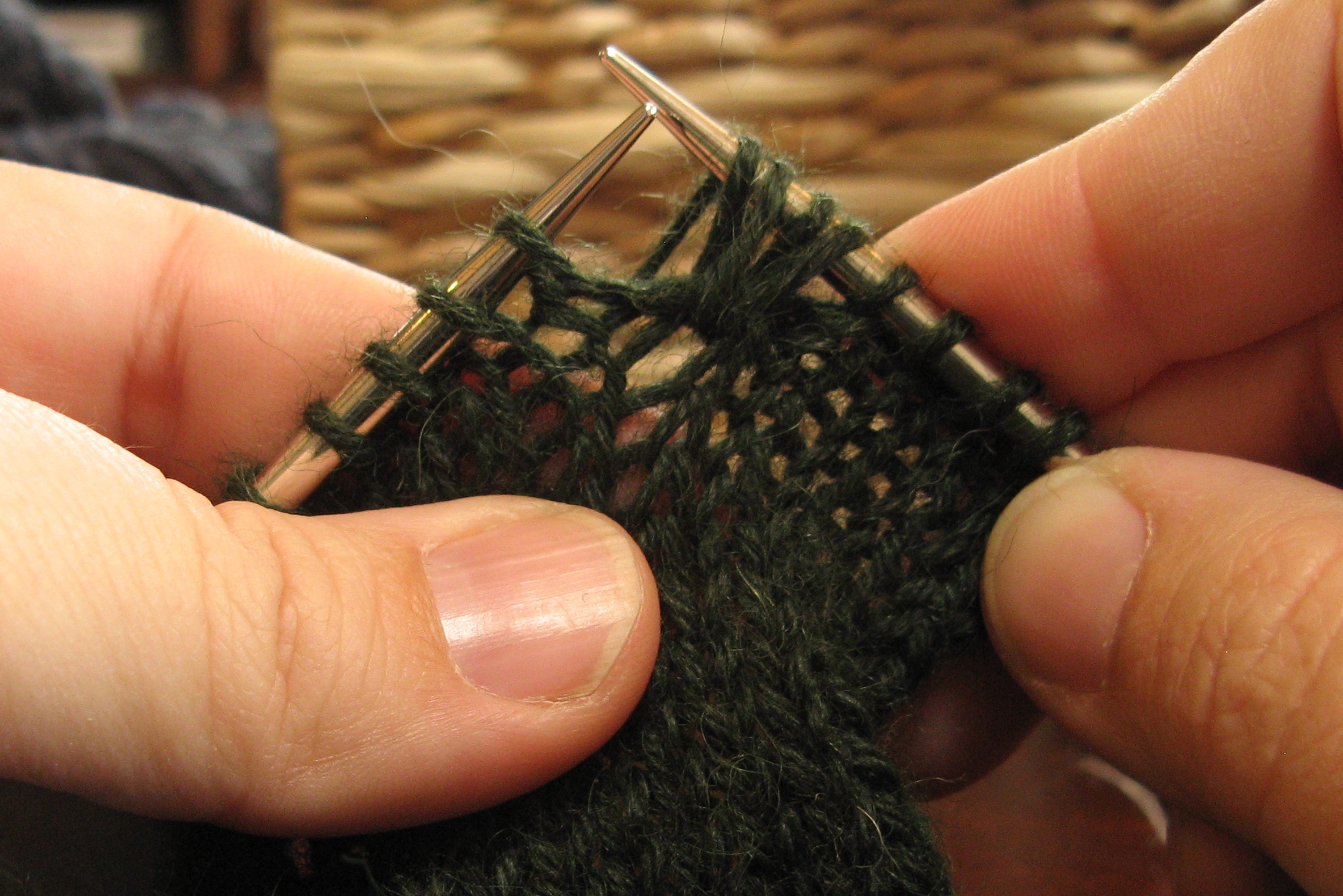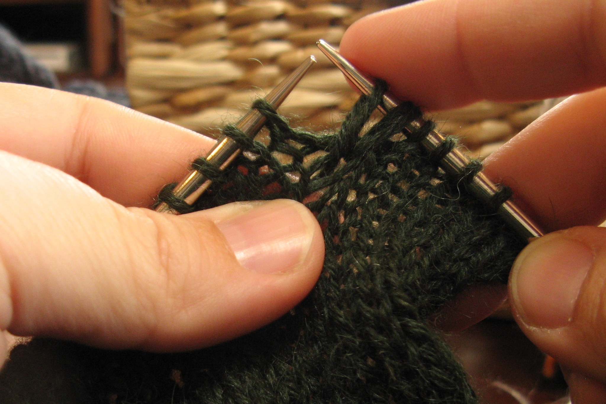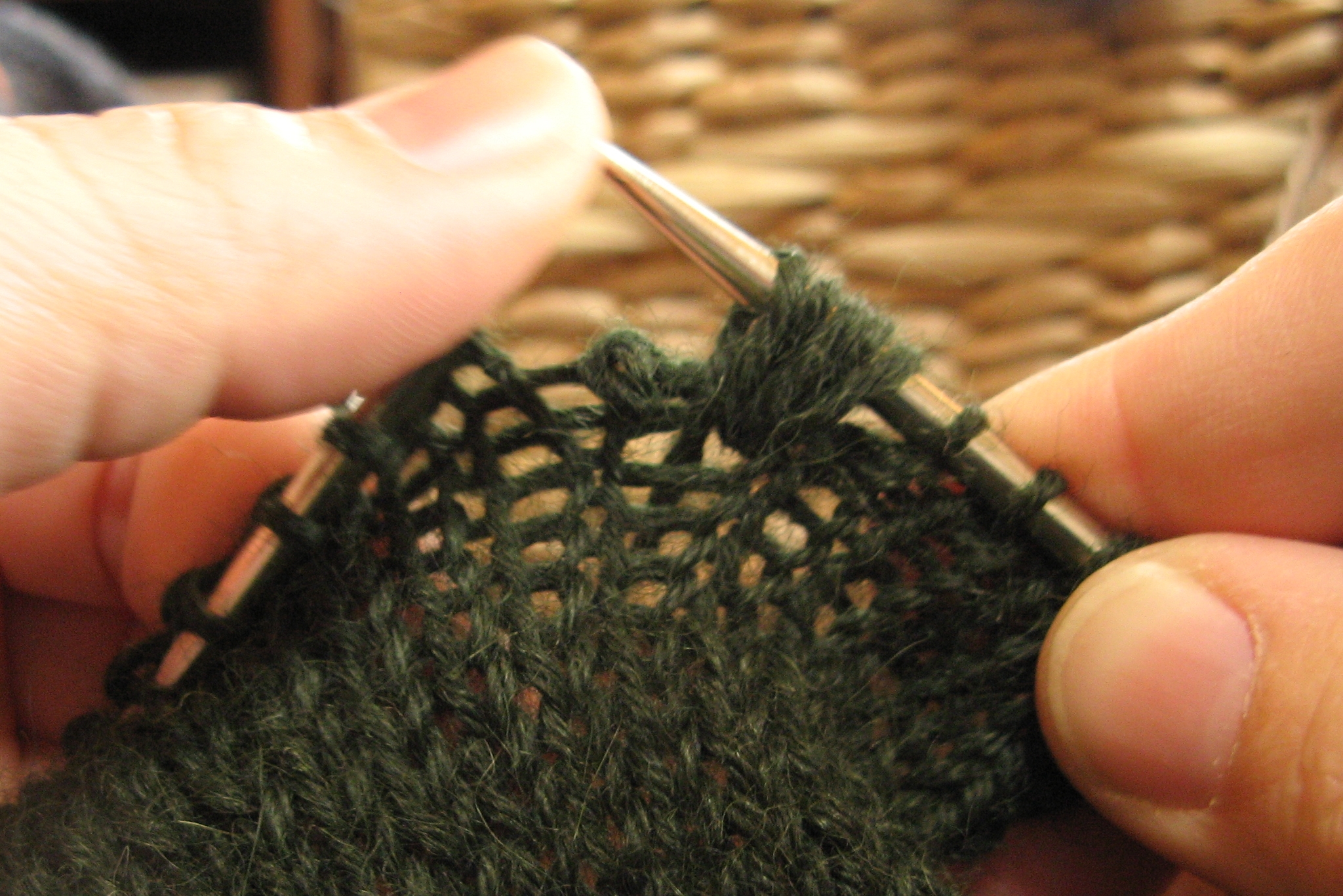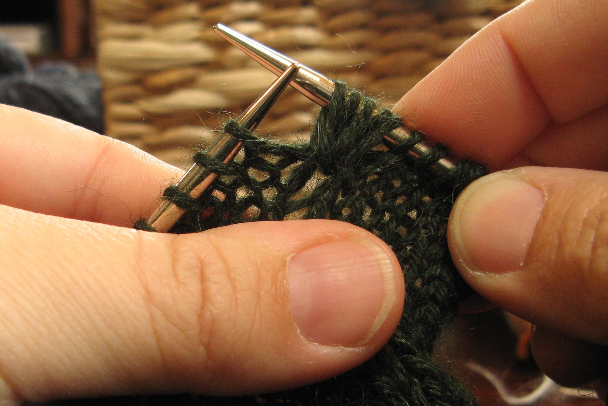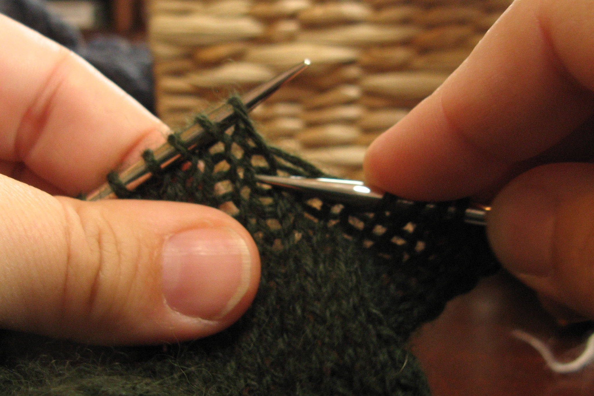 Step#1: Identify the target stitch, into which we will be working.  The first stitch on the left needle is “zero” — count down 1, 2, 3 holes. In this photo, the right needle is beginning to enter the target stitch.