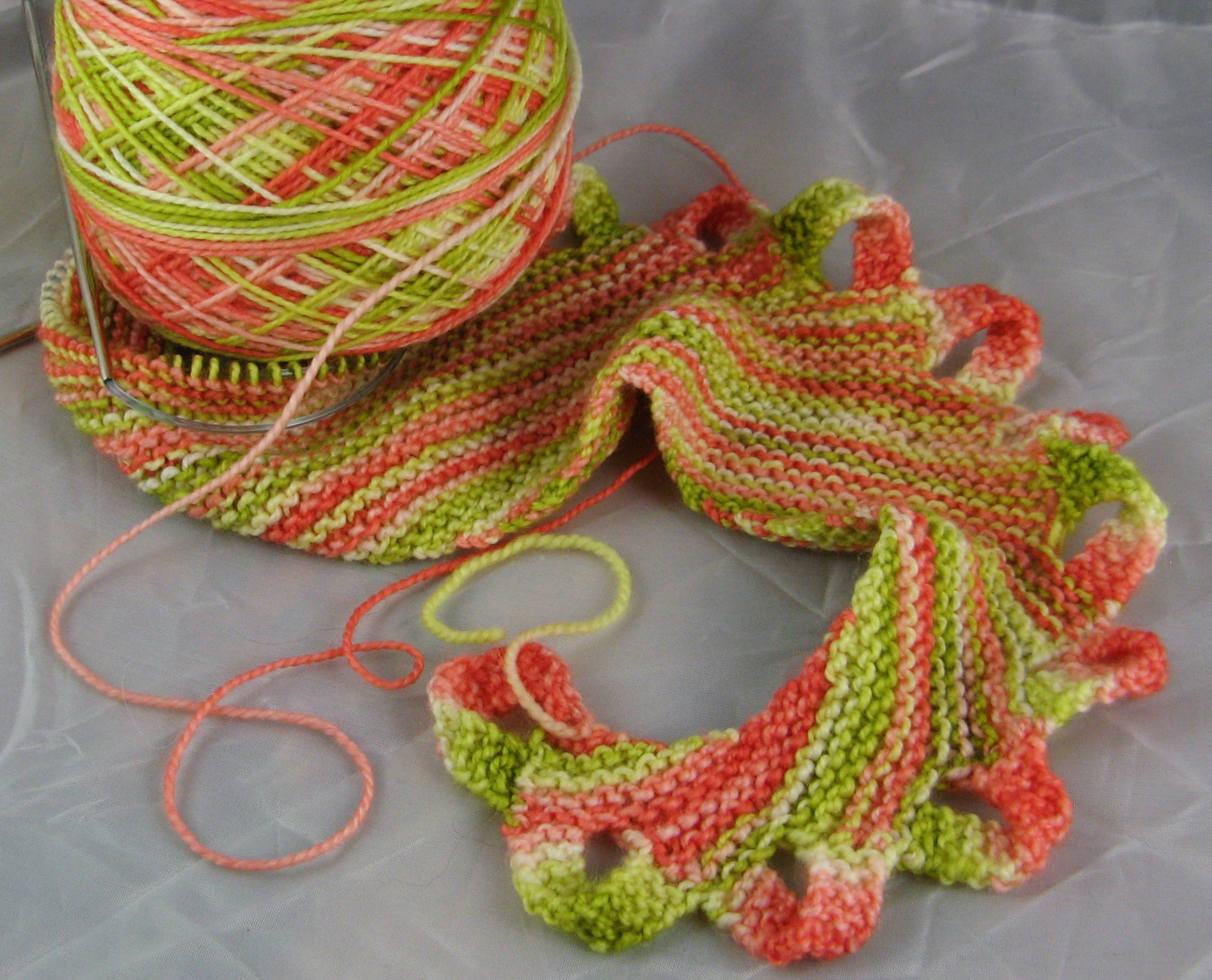 Jane Knitter doesn’t have enough fingering-weight yarn in her stash to make this shawl, but she does have some DK and worsted-weight yarn in large enough quantities to make the shawl … or does she? If she uses a #7 needle with a thicker yarn, the fabric won’t have the right characteristics. The thicker the yarn she substitutes, the more firm and dense the fabric will be. If she tries to make the shawl with a #7 needle and 500 yards of worsted-weight yarn, she won’t run out of yarn … but she may create a “shawl” that is much more stiff than she wanted. Try it with a bulky yarn and the shawl may stand up all by itself!