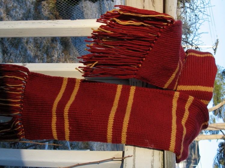 This Friday, I’m proud to say that I finished the Harry Potter scarf I’ve been working on since January! This is my third time doing one of these. This one is for a friend-of-a-friend who is going through some tough times … I have to admit, I had a hard time motivating myself to do yet more stockinette, but I designated this project as my penance knitting about two weeks ago, and that did the trick. Poof, done!